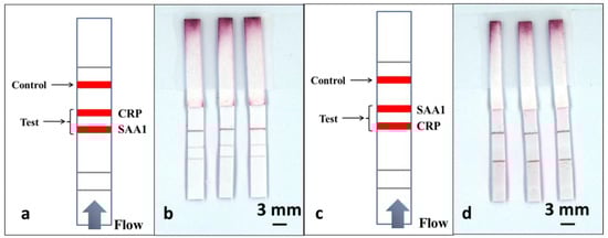 Schematic of a single-channel multiplexed LFD with multiple test lines along the same flow-path for multiplexed detection of CRP and SAA1, (a) with the SAA1 test line being before that for CRP and (c) with the CRP test line before that for SAA1. (b,d) are scanned image shows the results for three such LFDs described in (a,c).