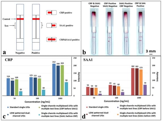 (a) Schematic of the laser direct-write (LDW) patterned multiplexed LFD with multiple channels for multiplexed detection of CRP and SAA1; (b) scanned image shows the multiplexed detection of CRP and SAA1 using LDW patterned dual-channel LFDs described in (a); (c,d) plots showing direct comparison of the measured colour intensities of test lines that appeared in standard single LFDs, single-channel multiplexed LFDs and our LDW-patterned dual-channel LFDs for detection of CRP & SAA1 respectively at concentrations of 50 ng/mL, 100 ng/mL and 1 µg/mL. Error bars indicate the standard deviation for 3 individual measurements.