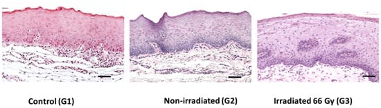 To understand the changes induced by irradiation, we compared the control and oncology groups. The histological analysis of the healthy control group revealed normal stratified composition along with keratinization of the epithelial layers. There were no signs of inflammation, atypical, or dysplastic cells. Similar microstructural arrangement was observed in “non-irradiated control” samples. In irradiated specimens, the epithelial cell layers appeared thicker, also some of the cells had expanded cytosol and cell nuclei. Typical histological findings of the oral mucosa in different study groups are shown in Figure 1.