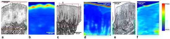 Representative white light (a,c,e) and corresponding FTIR chemical maps (b,d,f) using glycoprotein band (1385 cm−1). Areas of spectral extraction in the superficial layer of control (a,b), non-irradiated (c,d), and irradiated (e,f) samples are marked.