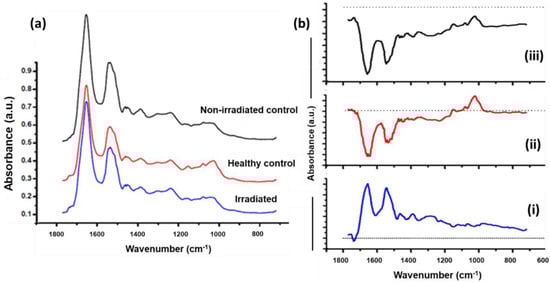 In the next step, average FTIR spectra in the fingerprint range (720–1770 cm−1) were extracted from the superficial layers. As shown in Figure 3a, differences in the spectral bands related mostly to nucleic acids, lipids, and proteins were observed. Spectra from healthy control show strong nucleic acid features originating from symmetric and asymmetric stretching of phosphodiester bonds (1030 cm−1,1242 cm−1) and phosphate (1082 cm−1) with respect to irradiated and non-irradiated controls [13,21]. Spectral differences in terms of broadening of amide III (1284 cm−1), amide II (1550 cm−1), and amide I (1640 cm−1) in non-irradiated control and irradiated specimens indicates changes in the protein structural arrangement. Furthermore, to bring out spectral changes among three groups clearly, difference spectra were computed and shown in Figure 3b. This is one of the conventional ways of representing spectral differences that can occur over a selected spectral range and can help in understanding the moieties that are being modified. The subtracted irradiated spectrum (i) has spectral bands belonging to amide I and amide II, suggesting its predominance in non-irradiated controls. Small dips around 1736 cm−1 and 1162 cm−1 suggests its presence in irradiated specimens. Less nucleic acids and broad amide bands were noted on comparison of irradiated specimens with healthy controls (ii). We have also compared two different controls used in the study (iii). The difference spectrum has positive predominating nucleic acid and lipid features from healthy controls, and negative amide I and amide II bands from non-irradiated control.