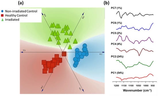These spectral differences were further utilized to test the feasibility of classification among three groups using principal component analysis (PCA). A total of 39 healthy control, 21 non-irradiated control, and 24 irradiated spectra in the range 950–1200 cm−1 were used as input for PCA. As shown in the linear projection plot, exclusive clusters belonging to each patient group were obtained (Figure 4). Loading plots indicating spectral features utilized for classification are also shown. Corroborating with spectral differences from the mean spectra loading plots also indicates nucleic acid (1082 cm−1) as the major discriminatory feature. The slight spread of data points in the irradiated group can be attributed to differences in the radiation dose received by each subject.