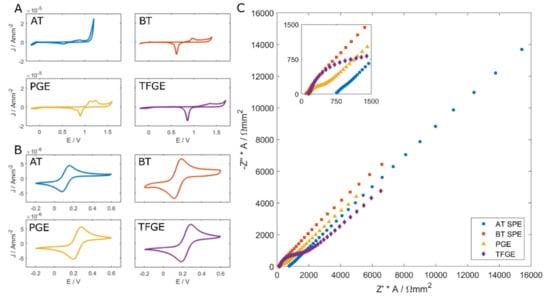 The cleaning CVs (Figure 2A) show typical responses for gold immersed in H2SO4. AT and BT SPEs show different gold oxide formation and reduction profiles which can be attributed to the different crystal faces predominating on the gold particles employed in the ink, possibly resulting from the different curing temperatures []. The CV voltage windows for each SPE type are also slightly different. AT electrodes produce a large oxygen evolution peak beyond +1.2 V, whereas BT electrodes produce this response above +1.4 V. The width of this potential window is related to the proportion of exposed gold, with higher proportions producing a narrower voltage window []. The cleaning CVs for the PGEs and TFGEs are similar, which is to be expected, as these both exhibit a pure gold surface. Small differences possibly arise from the effect of the different cleaning methods employed.