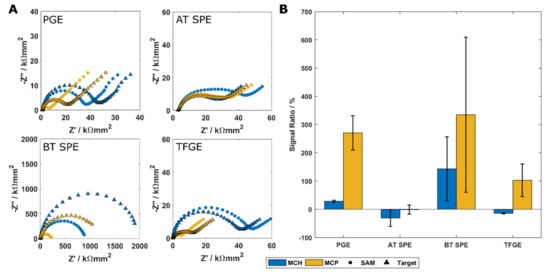 The PGE and BT SPE both exhibit the expected behaviour in response to DNA target binding, with an increase in Rct observed independent of SAM composition. The BT SPE had significantly larger impedance responses than the PGE, which may be a result of the proportion of exposed gold being relatively low compared to other electrodes, resulting in a smaller conductive area []. Both the AT SPEs and the TFGEs showed similar impedance responses with an MCH SAM. The AT SPE shows an unexpectedly large impedance with an MCP SAM relative to the MCH SAM. There may be some effect from the surface roughness or ink composition here, causing the mixed monolayer to form in a way which produces a greater impedance than expected. This may be supported by the TFGE, which shows a similar MCH impedance response and a more typical MCP response.
