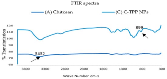 The absorption peak that appeared at 2923.88 cm−1 indicates the presence of CH stretch. The peaks at (1636, 1412,1153 and 1323) cm−1 were attributed to secondary amide stretch, CH2 bending, CH3 symmetrical deformations and ʋs(C–O–C) (glyosidic linkage), respectively. C-TPP NPs spectrum shows new peaks at 899 cm−1 which was assigned to the characteristic bands of TPP polyions (P-OH and P=O stretches) [15]. The formulation of C-TPP NPs by the ionic gelation method (ionic crosslinking technology) is based on the formation of complexation between the positively charged amine group of chitosan and negatively charged polyions in tripolyphosphate (TPP) as reported in Aruna et al. [6] and Wang et al. [16].