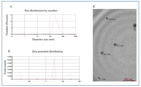 The hydrodynamic diameter and the surface charge of the C-TPP NPs were analyzed by dynamic light scattering (DLS) using ZS-ZEN (Malvern Instruments Co., Malvern, UK). The instrument measures the particle diameter size in the range from 0.6 to 6000 nm and the surface charge in the range from −200 to 200 mV. The samples were measured at a scattering angle of 173° at room temperature.