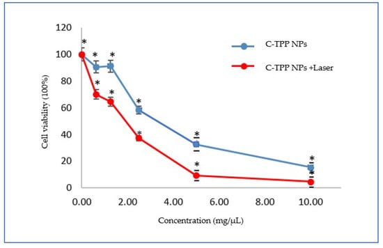 Cell viability assay on Caco2 cells versus the concentrations of C-TPP NPs, in the absence and in the presence of laser irradiation Data presented as mean ± SD. * p < 0.05 compared between the two groups.