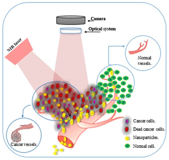 Schematic illustrates • the different structure between cancerous cells and normal cells, • the different structure between cancer blood vessels and normal blood vessels, • nanoparticles accumulation in cancerous tissue, • Near-infrared (NIR) has a maximum depth of penetration in the biological tissue.