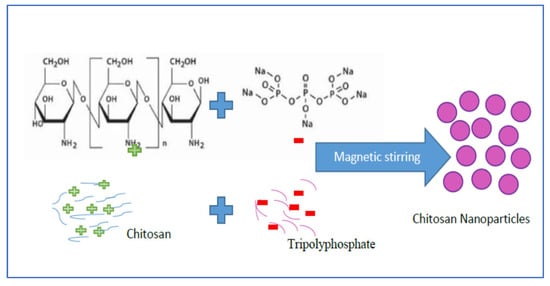 The chitosan NPs (C-TPP NPs) was formed by the ionic gelation method (ionic crosslinking technology). That was based on the interaction between the positively charged amine group (chitosan) and negatively charged polyanions (tripolyphosphate (TPP)). Cationic solution of chitosan was obtained by dissolving 100 mg of chitosan powder in 1% diluted acetic acid (100 mL) under continuous magnetic stirring for 2 h at 2000 rpm. The anionic solution of TPP was obtained by dissolving TPP into the distilled water, then the TPP solution was dropped into a cationic solution of chitosan under magnetic stirring (Scheme 2).