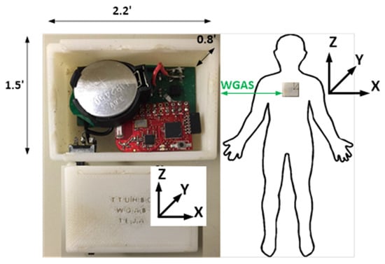 A diagram of the wireless gait analysis sensor is shown with dimensions and the axis orientation. The sensor is worn by subjects on the back at the T4 level.
