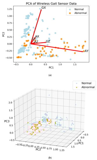 The first two principal components (PCs) from PCA were able to describe approximately 83% of the variance of the data. The largest loading for the first principal component is 0.94 for AY, which is the linear acceleration on the y-axis (i.e., the acceleration along patient’s forward movement direction during the DGI tests), with the next largest loading equal to 0.26 for GZ, the z-axis angular velocity (i.e., the angular velocity along the azimuth axis) [12]. The second principal component has the largest loading of 0.95 for GX, the x-axis angular velocity. The third principal component has most of the weight on the x-axis acceleration (AX) with a loading of 0.74, while the y- and z-axis angular velocities (GY and GZ) have loadings of 0.46 and 0.39, respectively. With three PCs, 94% of the variance of the data is explained. The projection onto two-dimensional space is shown with loading vectors in Figure 2a. With three PCs, abnormal gaits are separated from normal gaits (Figure 2b).