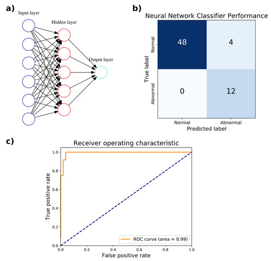 Artificial neural network (ANN) classification of normal versus abnormal gaits measured by the WGAS. (a) The optimal ANN architecture for classification with a single hidden layer consisting of five units is depicted. (b) The confusion matrix compares the true classification of normal or abnormal gait against the predicted classification. (c) The receiver operating characteristic (ROC) curve with the area under the curve (AUC) of 0.99 is shown.