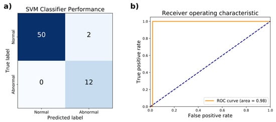 Test set performance of the support vector machine classifier on distinguishing normal from abnormal gaits. (a) The confusion matrix comparing the true classification of normal or abnormal gait against the predicted classification is shown. (b) The receiver operating characteristic (ROC) curve achieves an area under the curve (AUC) of 0.98.