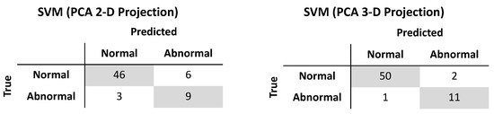 Dimensionality reduction with PCA allowed for classification performance approaching that of the full dimensional data. Specificity of classification upon projection by PCA onto a three-dimensional subspace was identical to classifying on the full dimensional data. The difference in performance came from the sensitivity: when retaining three PCs, only one patient with abnormal gait was misclassified while classification on the full dimensional dataset had perfect sensitivity. As expected, classification performance by SVM increased when retaining three PCs compared to retaining two PCs. Interestingly, dimensionality reduction did not lead to improvements in memory usage, and while execution time of predictions were shorter, the gains were modest: an improvement of 11% and 4% with two and three PCs, respectively. The use of PCA necessitates the storage of the projection matrix to project the test set or any new data onto the lower dimensional subspace, which may account for the observed memory usage.