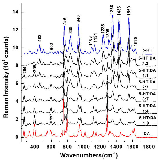 Although label-free detection of DA and 5-HT is reported in various works [39,40,41,42,43,44,45,46], only a single study suggests their potential chemical interaction with each other and the formation of a new compound [33]. This is surprising, considering their biological proximity and physiological co-existence within the striatum [28,29], as well as their chemical similarity. Thus, keeping in mind the likelihood of their interaction, as well as continuing our previous work on their simultaneous in vitro detection [39], we first explored a possible quantification of 5-HT and DA in different mixtures. It is known that Raman spectroscopy can provide such relative quantitative information. However, for an easier and more precise analysis, the high concentrations of 10−2 molar were first considered for such mixtures. The Raman results, of 5-HT and DA alone, and those of 5-HT:DA mixtures with ratios of 7:3, 1:1, 2:3, 3:7, 1:4, and 1:9, are presented in Figure 1. While the 5-HT Raman spectrum (blue color) has a multitude of characteristic vibrations at 463, 602, 759, 835, 940, 1103, 1134, 1235, 1308, 1356, 1435, and 1550 cm−1, sharp vibrational lines at 264, 395, 597, 750, 795, 935, 1013, 1117, 1148, 1290, 1450, and 1620 cm−1 can be observed in the DA Raman spectrum (red color).