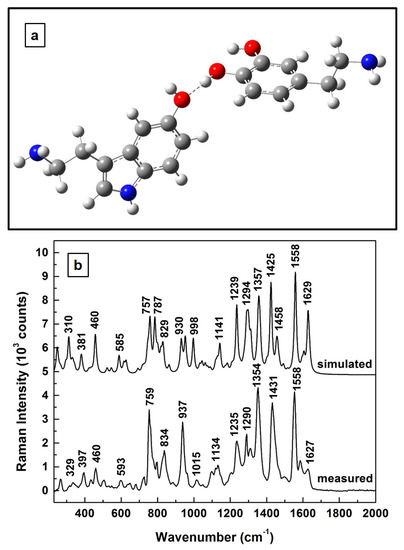 Consequently, it is natural to ask how the theoretically predicted Raman spectrum of the 1:1 molecular interaction of 5-HT and DA compares with that experimentally determined above in Figure 1. This evaluation is presented in Figure 3. As can be visualized in Figure 3a, where the predicted structural representation of this new composite is shown after appropriate energy minimization, a stable configuration occurs for a molecular interaction through hydrogen bonding between the two compounds. A serotonin molecule almost perpendicular to the dopamine benzene ring is also observed in this configuration. Furthermore, a look at the two associated Raman spectra, which are presented in Figure 3b, demonstrates good agreement between the computationally determined vibrations and the experimentally obtained ones, with differences of ±5 cm−1 for the positions of the most intense vibrational lines. A scaling factor of 0.98 has been used for the simulated frequencies to overcome the known systematic empirical errors originating from the force field constants employed in quantum mechanical approaches. Also, for easier visualization, a vertical translation of the spectra was performed. Thus, the similarity between these two Raman spectra further corroborates our assumption of the formation of a new composite.