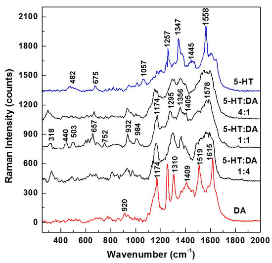 Raman spectra of serotonin (5-HT) and dopamine (DA) at 10−2 molar concentrations, for their mixtures at different ratios, as labeled. The spectra are vertically translated for easier visualization.