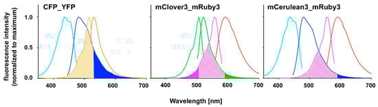 To overcome the restriction of a fixed “counter” wavelength in these scans we recorded the fluorescence intensity over a two-dimensional matrix ranging from 370–600 nm for the excitation and from 405–670 nm for the emission wavelength as described in Materials and Methods, with the fluorescence intensity being the third dimension, very similar to a procedure we have earlier used to characterize the fluorescence properties of small molecules []. Although the long recording times had a moderate impact on protein stability as evidenced by a moderate loss in signal intensity after repeated 3D spectra recordings with the same sample (data available in Supplementary Material), the reproducibility of spectra was excellent when the slight loss in signal intensity was compensated by normalization to the maximum intensity in the given spectrum (Figure 4D and the data collection provided in Supplementary Materials). 3D spectra were recorded for CFP, YFP, mVenus, mCerulean3, mClover3 and mRuby3 and represented as surface plots in MATLAB (Figure A2). Close inspection of the 3D spectra further substantiated our hypothesis that the combination of mCerulean3 and mRuby3 as a FRET pair may compare favourably to the use of either CFP_YFP or mClover3_mRuby3 because of an apparent much lower overlap of the donor and acceptor emission spectra. Furthermore, the similarity of CFP to mCerulean3 and of YFP to mVenus became even more evident. After normalization to the respective maxima, their spectra could be almost perfectly superimposed, which facilitated to calculate the quantum yields for our CFP and YFP variants that were not available from the literature (Table 1).