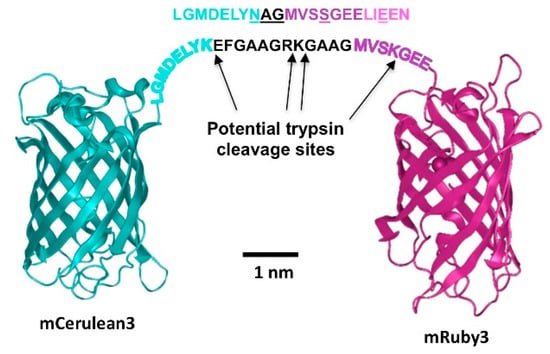 mCerulean3_mRuby3 FRET fusion construct. The proteins are represented based on the reported crystal structures of their closest relatives (5oxb for Cerulean [], 3u0l for mRuby []). The amino acid sequence of the non-native peptide linker is shown in black print. The sequences in cyan represent the native Cerulean C-terminus that is flexible and thus not visible in the high resolution structure. The mRuby3 N-terminal flexible sequence is given in dark magenta. Potential trypsin cleavage sites in these sequences are indicated by the arrows. Above the fusion protein linker, the corresponding sequence that replaces it in the trypsin-resistant fusion protein is indicated. All positions where trypsin cleavage sites have been eliminated are underlined. The print size of the peptide sequences was chosen to occupy approximately the space of the amino acid sequence when stretched completely, and a scale bar based on the three-dimensional (3D) structure dimensions is included.