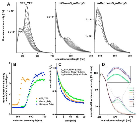 The tryptic digest results in an almost complete eradication of the FRET component of the spectra and a compensatory increase in the donor emission intensity for all three FRET pairs in the course of the incubation period (Figure 4A). However, the donor intensity increase in the CFP_YFP spectrum is extremely small compared to the massive loss in the associated FRET signal intensity. On the first sight, the most prominent FRET signal was obtained with the CFP_YFP pair. However, this is partly explained by the fact that the signal rides on the substantial background of donor emission. Quantification of the results revealed highest dequenching of donor fluorescence and strongest FRET signal reduction in relation to remaining background for the mCerulean3_mRuby3 pair, followed by the mClover3_mRuby3 pair, followed by the CFP_YFP pair (Figure 4B). The time course analysis revealing the half-lives of the fusion proteins of < 4 min during trypsin digestion (Figure 4C) and the control experiments (Figure 4D) finally indicate that the proteolytic cleavage is essentially complete after 20 min and the reproducibility of spectra is very high.