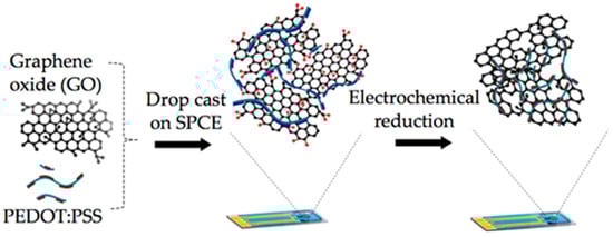 The fabrication process of the modified SPCE electrode is shown in Figure 1. The graphene oxide that was initially mixed with PEDOT:PSS was electrochemically reduced to convert the composite into rGO-PEDOT:PSS. The reduction process removed the oxygenated functional groups at the edges of the graphene oxide, thereby eliminating some of its insulative properties [].
