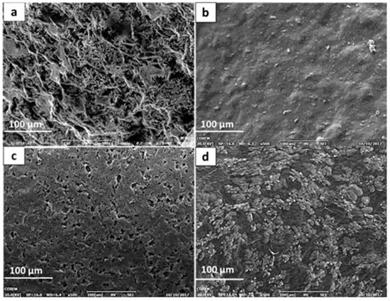 SEM images at 10x magnification of SPCE modified with (a) rGO, (b) PEDOT:PSS, (c) GO-PEDOT:PSS, and (d) rGO-PEDOT:PSS. The rGO layers appeared flaky with a discernible spacing between layers, whereas the PEDOT-PSS appeared as a well-dispersed surface of colloids. The rGO-PEDOT:PSS composite layer appeared to form a dispersion of colloidal aggregates that occupied the interlayer spacing. This dispersion appeared to be different compared to the GO-PEDOT:PSS composite layer, which may have been attributed to the different stacking characteristic of GO and rGO.
