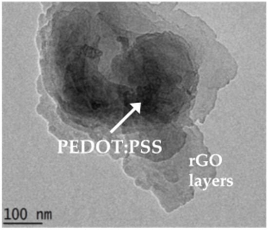 The TEM image shows several layers of rGO with inter-dispersion of PEDOT:PSS, which appeared as a darker layer. This shows that PEDOT:PSS had diffused into the layers of the stacking and formed the π-π interaction between PEDOT:PSS and the surface of the rGO layers [,]. The rGO layer image is in congruence with the images from Abdolhosseinzadeh et al. [], and the rGO-PEDOT:PSS agrees with Chen et al. [].