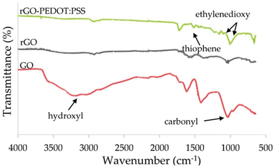 FTIR analysis of the transducer materials. The FTIR plots compare the functional-group composition between GO (red), rGO (grey), and rGO-PEDOT:PSS (green).