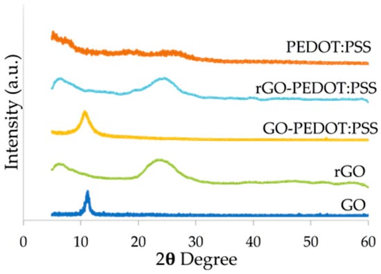 X-ray diffraction intensities of the different transducer composites. The XRD spectrum compares the diffraction between GO, rGO, GO-PEDOT:PSS, rGO-PEDOT:PSS, and PEDOT:PSS. Shift in the 2θ angle could be seen between GO and rGO in the spectra both with and without PEDOT:PSS. The peak intensities for GO and GO-PEDOT:PSS were observed at 10.7° and 10.3°, respectively, whereas for rGO and rGO-PEDOT:PSS, they were observed at 24.5° and 23.5°, respectively.