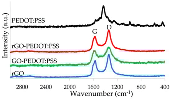 Raman spectra of rGO (blue), PEDOT:PSS (black), GO-PEDOT:PSS (green), and rGO-PEDOT:PSS (red). The D and G bands of rGO, GO-PEDOT:PSS, and rGO-PEDOT:PSS were clearly visible in the spectra, whereas the PEDOT:PSS spectrum showed a clear thiophene peak at 1434 cm−1. A raised intensity at 1434 cm−1 in both the GO-PEDOT:PSS and rGO-PEDOT:PSS spectra, compared to rGO, suggests the presence of PEDOT:PSS in the composite.