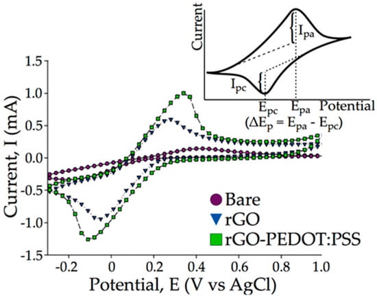 Cyclic voltammetry comparison between rGO and rGO-PEDOT:PSS corroborated the characteristic contribution of PEDOT:PSS as a conducting polymer. It can be seen in Figure 7 that the peak current increased with the addition of PEDOT:PSS when comparing voltammograms of electrodes modified with rGO and with rGO-PEDOT:PSS. The result shows that the redox reaction at all electrodes in ferricyanide solution was reversible with oxidation and reduction. The rGO-PEDOT:PSS/SPCE (Ipa = 1.005 mA) exhibited larger current responses and better defined redox peaks towards analytes than did the rGO/SPCE (Ipa = 0.613 mA) and unmodified SPCE (Ipa = 0.024 mA).