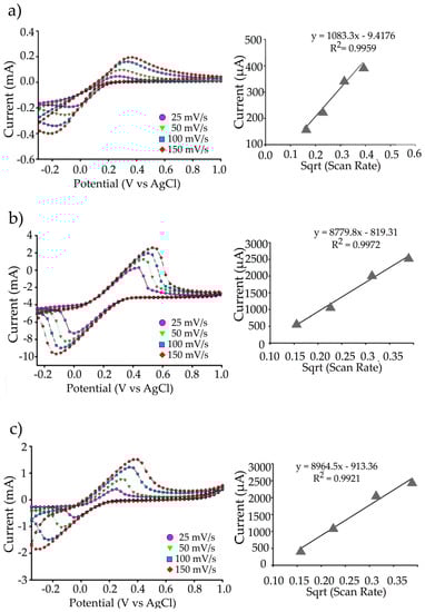 Scan-rate measurements of (a) SPCE, (b) rGO/SPCE, and (c) rGO-PEDOT:PSS/SPCE. Cyclic voltammetric measurements were taken at scan rates of 25, 50, 100, and 150 mV/s. Linear regression plots were derived from the scan-rate voltammogram by plotting the corresponding peak currents and potentials at each scan rate.
