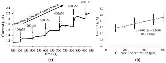 Figure 9a shows a sample of the amperometric current versus time curve of glucose introduced onto the rGO-PEDOT:PSS-GOx electrode. Incremental addition of glucose onto the electrode resulted in a stepwise increase in current. This suggests that the electrode could detect changes in glucose concentration within the range of 100 µM to 600 µM. This is also reflected by the linear plot throughout the calibration curve in Figure 9b. From here, the sensitivity of the glucose detection was obtained as 57.3 µA/(mM·cm2) and its limit of detection at 86.8 µM glucose, per standard calculation [,]. The sensitivity and limit of detection of this initial setup appeared to be within an acceptable range compared with those of other modified electrodes [].