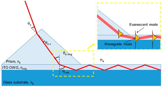 A λ/4 Rutile TiO2 prism (Thorlabs GmbH, Newton, MA, USA, 45-45-90, size 5 × 5 × 5 mm) having a refractive index (np = 2.6), higher than the refractive index of the ITO (nowg = 1.82), was used to couple part of the power contained in the laser beam source to the thin ITO OWG (350 nm). Such a method does not need sub-micrometer alignment of the beam to the edge of the OWG, or the need for matching the numerical aperture of the illumination optics to the film. The laser beam can have a diameter tens of times that of the OWG when coupled by means of the prism, and still a consistent fraction of light power will enter the OWG.