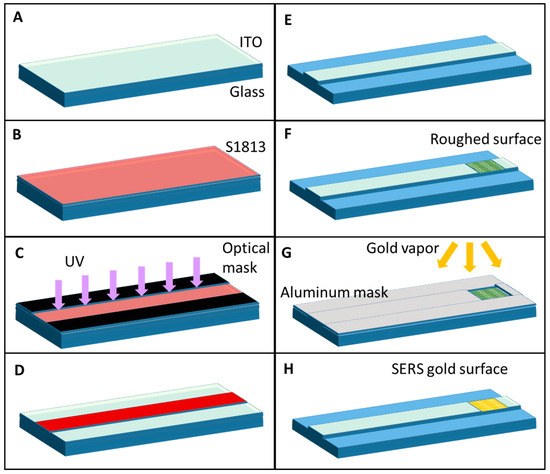 Schematic representation of the fabrication process: (A) glass + ITO substrates are clean; (B) the positive photoresist S1813 is spun on the substrate; (C) the sample is exposed by UV light under an optical mask; (D) the exposed resist is developed; (E) the ITO is wet-etched to create the OWG; (F) the ITO is roughened on one side of the OWG; (G) the sample is exposed to gold physical vapor deposition under an aluminum mask to create the SERS surface on top of the ITO roughened surface; (H) final device.