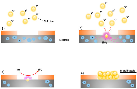 Schematic representation of electroless deposition of gold nanoparticles. (1) Au3+ ions in the solution near the silicon (Si) surface (in grey), in the proximity of the nanoholes patterned in the resist (in orange), capture electrons from the Si valence band; (2) a redox reaction starts between gold ions and Si, evolving in the Au3+ reduction into metallic gold nanoparticles and the oxidation of silicon into SiO2; (3) the hydrofluoric acid in solution reacts with the silicon oxide inducing the etching of SiO2 and the dissolution of it as SiF62- (violet cloud); (4) the Au nuclei deposited continue to attract electrons from bulk silicon, working as a catalytic surface for the reduction of new Au3+ ions until the desired thickness is reached.