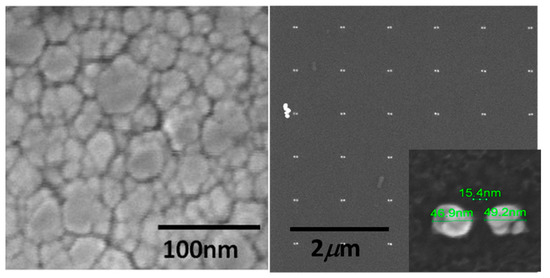 In Figure 4 (right), the nanodimers matrix is shown and, in the inset, a representative dimer, as fabricated by means of the electroless process. The grown Au layer is roughly 50 nm thick with a standard deviation of 10 nm. The nano-dimers ensure giant SERS enhancement during Raman spectroscopy analysis. In this case, the periodic arrangement ensures reliable measurements and the high spatial localization (in the gap) allows for measuring complex mixtures without pre-treatment, as explained in the previous sections. Finally, a similar configuration allowed quantitative measurements [27].