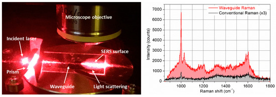 Left: Schematic representation of device layout: Optical set-up displaying the incident laser beam, the prism, the OWG, and the light scattering from the SERS surface (rough estimation of losses showed the value of optical losses >95%, which is in agreement with that published in literature [36], see Supplementary Materials); Right: Raman spectra of phenylalanine taken by conventional Raman spectroscopy (in black) and by using the developed device (in red).