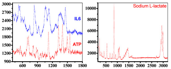 Left: Raman spectra for ATP (red) and IL6 (blue), measured between 500 and 1800 cm−1, Right: Raman spectra for Sodium L-Lactate, measure between 100 and 3300 cm−1, (information on the enhancement factor can be found in the Supplementary Materials).
