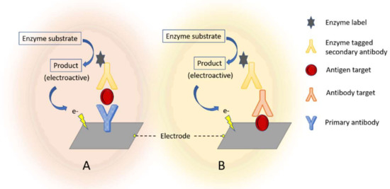 Scheme showing the basic components of electrochemical immunosensors with enzyme labels: A. antigen’ detection principle; B antibody’s detection principle (adapted from [46]).