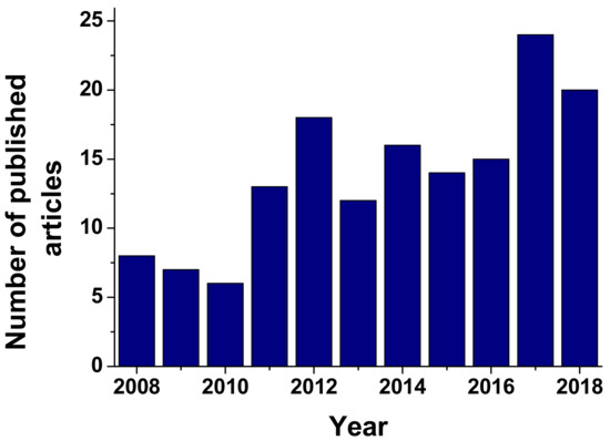 Developing peptide based biosensors instead of immunosensors or aptasensors is a continuously growing tactic, and more and more articles are being published (Figure 2).—from 2008, whenonly eight articles were reported in Scopus [75] having the words peptide based biosensor in their title, up until 2018, when 20 articles were published using the same criteria. Starting in 2008 when 34 articles reported peptide biosensors in their title, abstract or keywords, the number increased continuously up until 2018 when 89 articles were published under the same criteria. The ScienceDirect database was used for this classification.