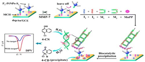 Matrix Metalloproteinases (MMPs) are a large group of Calcium-dependent endopeptidases. Their overexpression is usually correlated with a series of pathological conditions like inflammatory diseases or cancer. Moreover, MMPs are between the most used biomarkers in electrochemical peptide based detection. A number of biosensors for the selective detection of MMPs are reported in the literature (Table 2) using different electrode architectures and obtaining different results. The best limit of detection was obtained for MMP-7 (5 × 10−5 ng mL−1) [76] using a peptide and single-stranded DNA S1 modified platinum nanoparticles immobilized on AuNP modified Glassy Carbon Elecrodes (GCEs). In this case, the peptide served as a recognition element for the MMP-7. After the recognition event, the PtNP-S1 bioconjugates were released from the electrode surface. The indirect detection was made by measuring 4-chloro-1-naphthol oxidation using DPV, after a previous hybridization of the remaining S1 the electrode surface, after the MMP-7 recognition and the formations of DNA nanoladders, ideal nanocarriers for the loading of the enzyme needed for 4-chloro-1-naphthol oxidation (Figure 3). The biosensor presented a linear range for MMP-7 detection, using DPV measurements of 2 × 10−4–20 ng mL−1 [76].