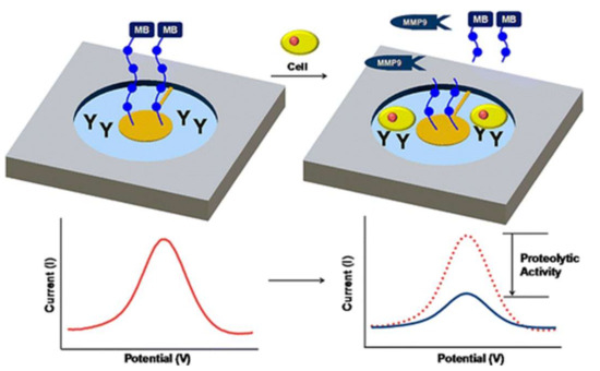 A simpler electrochemical peptide based biosensor for the selective detection of MMPs was developed by Donk-Sik Shin et al. In this case, a methylene blue modified peptide was immobilized on a 300 µM gold electrode. MMP-9 interaction with the platform leads to peptide cleavage and to a loss in the SWV signal (Figure 4). The biosensor is characterized by a LOD of 5.52 ng mL−1 and a linear range of 5.52–4.6 × 103 ng mL−1. Even though its analytical parameters are not as good as in the above study, this biosensor has the advantage that it was not only tested on real samples like serum samples, but it can also detect live MMP-9 release from monocytes [77].