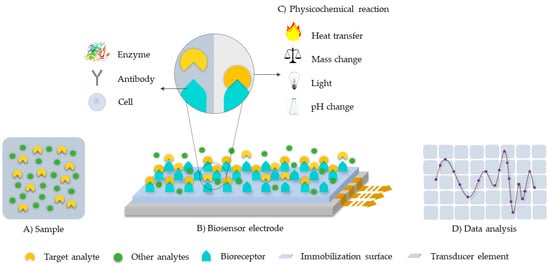 Schematic of a typical biosensor system architecture. The target analyte is detected by the bioreceptor and translated into a signal for analysis with the aid of a transducer. (A) Sample. (B) Biosensor electrode: composed by the bioreceptor, the immobilization surface and the transducer element. (C) Physicochemical reaction. (D) Data analysis.