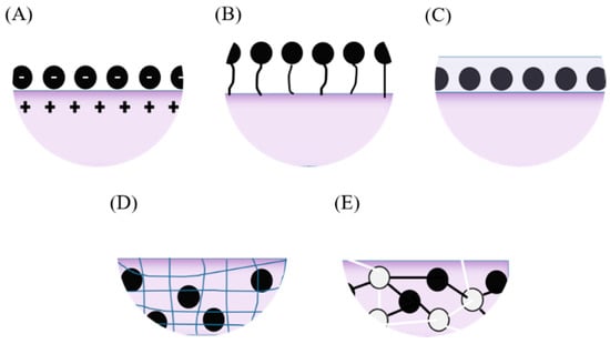 Enzyme immobilization onto electrodes. (A) Physically adsorbed through electrostatic interactions, (B) covalently bound to the surface, (C) entrapped within a film, (D) encapsulated within a porous surface and (E) cross-linked within the surface.