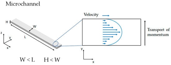 If for instance, we considered a microfluidic system with squared channels, it is conventional to find that the width of the channels (W) is considerably smaller than the length of the channels (L). Likewise, the height of the channel (H) is shorter than W (Figure 4). Under these geometry considerations, the problem can be considered unidimensional with molecular momentum transfer only in the y direction (Equation (7)):