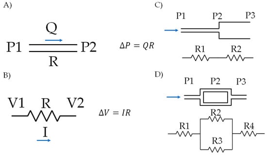 An easy and quick way to estimate the correlation between the pressure gradient, flow rate and resistance for a fluid within a microfluidic system is by using an electrical equivalent approach. To solve the equations, one can consider an analogy between the parameters in fluid mechanics and those of the electrical systems. Accordingly, the flow rate (Q) within the microsystem is due to a change in pressure (P) between inlets and outlets, which correspond to current flow (I) and the voltage potential (V) in circuits. In the two cases, an extra parameter must be considered, the resistance (R), which is understood as a restraining imposed by a system or material to the flow of fluids or electrons [,]. Figure 5 shows an example of different configurations of microsystems and the corresponding circuit analogy.