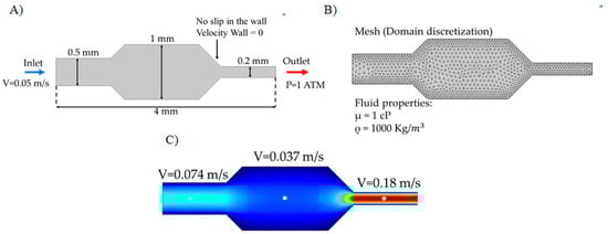Simulation of microfluidic system in Comsol Multiphysics ® (A) Simulation domain with the corresponding boundary conditions (inlet speed, outlet pressure and non-slip in the walls), (B) discretization of the domain by a meshing process and the list of physical properties of the fluid, (C) velocity profile in the channel as recovered from Computational Fluid Dynamics (CFD) simulations.