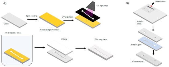 Chemical etching is based on eroding a surface to generate microchannels with depths ranging from 5–15 µm [,]. Glass is the preferred substrate to manufacture microsystems by this technique []. Chemical etching on glass starts by covering the surface with a sacrificial layer known as photoresist by means of a spin coating machine. Depending on the properties of the photoresist and the speed of the spin coating process, different sacrificial layer thicknesses can be generated. Next, the photoresist covered glass sheet is exposed to a mask with a layout of the microsystem. Subsequently, the two surfaces (photoresist and glass) are immersed in hydrofluoric acid. In areas with absence of photoresist, the glass surface is eroded, thereby generating the microchannel. Finally, the microchannel is sealed with a layer of PDMS []. Figure 7A shows a schematic of the etching process. While this technique offers a high resolution, the involved costs are relatively high due to the multistage processing required.