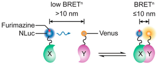Schematic of a NLuc based BRET (BRETn) design. Nluc is the donor fluorphore and Venus is the acceptor fluorophore. Nluc and Venus are fused to their respective proteins of interest (X and Y). BRET signal is detected when the proteins are in close proximity. Reprinted by permission from Springer Nature [14]. Copyright 2016.
